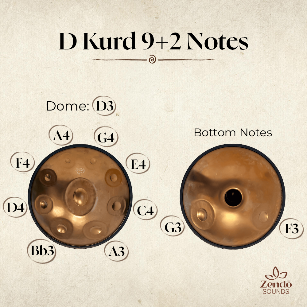 За начинаещи препоръчваме модел с 9 ноти в ре минор (D Kurd) – най-популярната и универсална скала. Скалата звучи приятно, хармонично и позволява както медитативно, така и по-ритмично свирене. За D Kurd ще откриеш възможно най-богатият набор от учебни видеа, курсове и разработени мелодии онлайн, което много улеснява първите стъпки. Също така е най-вероятно другите хандпан изпълнители, които срещаш, да разполагат с такъв инструмент, което позволява да свирите заедно.